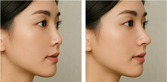 | 자연스러움 | 필러로 인한 볼록하거나 무거운 느낌 | 디자인에 따라 달라짐, 티 나는 경우도 있음 | 높지만 자연스럽고 얼굴과 조화되는 라인 완성 |